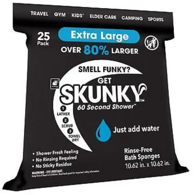 Perfect for situations where traditional bathing is impractical Skunky XL sponges are thick luxurious and bursting with lather ensuring a headtotoe clean. From outdoor work and camping to hiking postworkout recovery travel active kids or quick freshening up Skunky XL is the goto choice for maintaining cleanliness on the move.