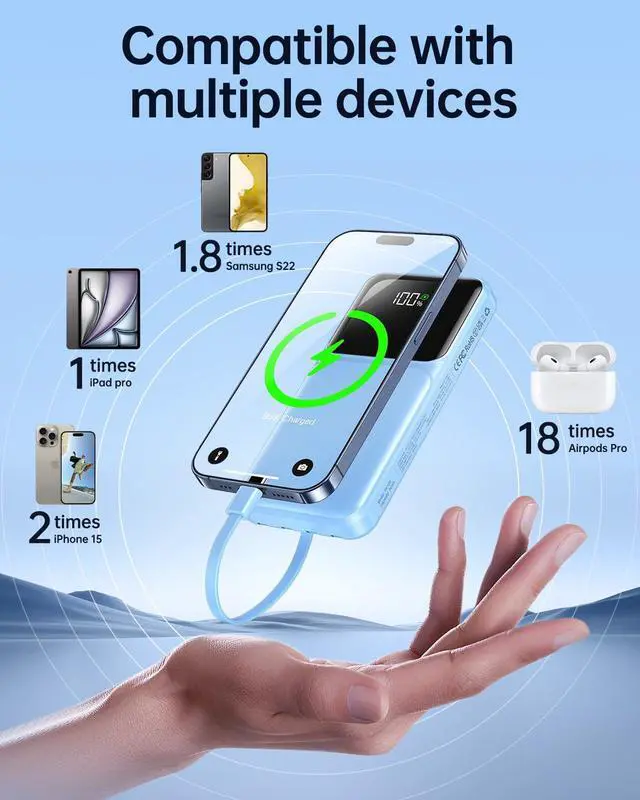 Travel Essentials Portable Charger with Built in Cables: Slim USB C 20000mAh power bank has 4 built in cables (iOS, Type C, USB, Micro) and 3 Charging port , Widely compatible with almost all types smart devices such as for iPhone 16/15/15 Plus/15 Pro/15 Pro Max, Samsung S23,S22,S21,S20, Google, Pixel, Android, iPad, Tablet and more. We use high quality materials to ensure the durability, tear resistance, and bend resistance of this power bank with built in cables. (Airline-approved) USB C and iOS Fast Charging Power Bank: The 20000mAh Multiple port Power Bank with built in USB C(22.5W) and iOS(20W) Output cables have QC4.0 & QC4.0 fast charge technologies can charge mobile phone at a maximum 3 times faster than conventional chargers. Ideal for those who need quick and reliable charging on the travel. Ensures you have enough power to enjoy your trip 5 Outputs & 3 Inputs Power Bank: This Portable charger power bank is designed with 5 outputs and recharge battery pack easily with 3 options. It supports 5 devices charging max simultaneously, no more cluttered charging adapters or cables on your desk now. A great portable charger for multi electronics users who has iPhone, android or micro devices! Upgrade USB C interface serves as both input and output, perfectly fit your new iPhones, iPad and all upcoming USB C devices Slim Pocket Size Portable Charger: This Slim 20000 power bank , and weigh only 0.53lb, portability just like a lighter cell phone, easily slipped into any travel lover's pockets or bag. With digital led display feature, no more hassle of guessing the remaining battery and you can recharge battery pack in time conveniently. A great portable charger for all people Safety System and LED Digital Display Portable Charger: This cell phone battery pack with built in cables is adopted intelligent power management IC and the highest grade materials, which can protect your device from overcharge protection, overvoltage protection, overcurrent protection, short-circuit protection, and overtemperature protection, take care of your electronic devices.Minimalist and elegant LED digital large screen display the battery power even accurately to 1%