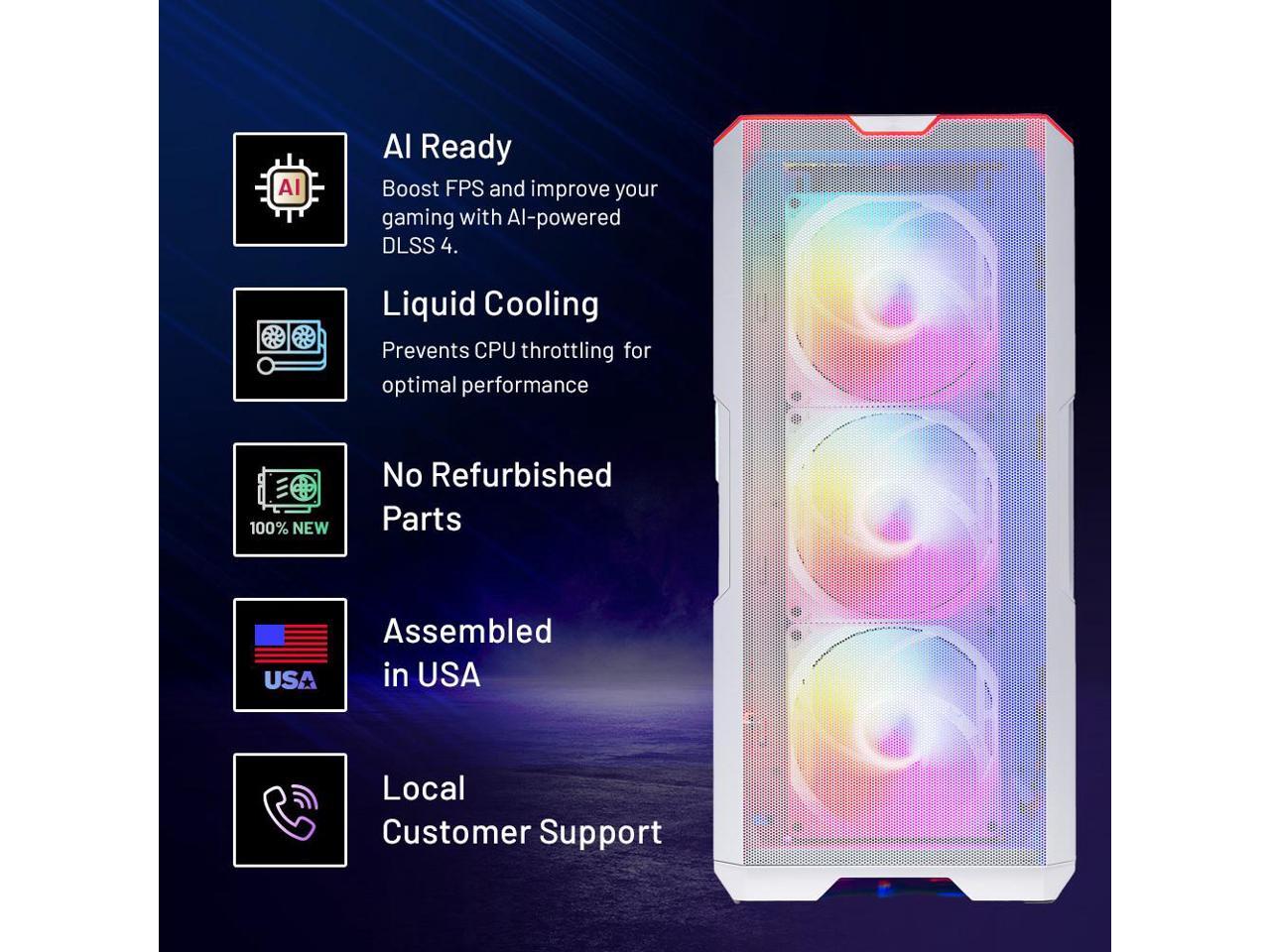 - AMD Ryzen 7 9800X3D 4.7GHz (5.2GHz Turbo Boost) CPU Processor | 2TB Gen4 NVMe M.2 SSD Up to 30x Faster Than Traditional HDD | 360mm AIO Liquid CPU Cooler with ARGB Fans, say goodbye to outdated and inefficient air coolers. NVIDIA Geforce RTX 5080 16GB GDDR7 Graphics Card (Brand may vary) | 32GB DDR5 RAM 6000 RGB Gaming Memory with Heat Spreader | Windows 11 Home 64-bit| 802.11 AC | No Bloatware | Graphic output options include 1 x HDMI, and 1 x Display Port Promised, Additional Ports may vary | USB Ports Including 2.0, 3.0, and 3.2 Gen1 Ports | HD Audio and Mic | Free Gaming Keyboard and Mouse| High-spec AIO liquid coolers used, delivering unmatched cooling performance for a perfect operational experience and unparalleled cooling performance. With hardware unrestricted by temperature limits, you can unleash its full potential. Whether gaming, creating, or working, you'll never suffer from thermal throttling again.| 1 Year Warranty on Parts and Labor| Assembled in the U.S.A