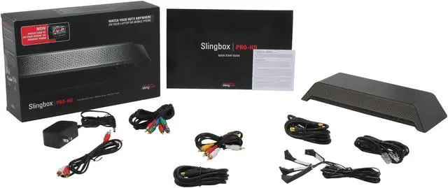 | Package Contents | 1 x Slingbox PRO-HD 1 x Quick Start Guide 1 x AC Adapter (100-240V, 50-60Hz) 1 x Ethernet Cable 1 x Coaxial Cable 1 x Composite AV Cable 1 x Component Video Cable 1 x Remote Control IR Cable 1 x S-Video Cable 1 x Stereo Audio Cable SlingPlayer software for PC/Mac is a free download with the purchase of a Slingbox * SPDIF Cable not included (sold separately) |