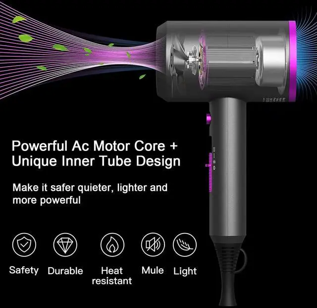 Professional Hair Dryer for Faster, Healthier Drying & Styling Tired of long drying sessions that damage your hair? Our professional hair dryer is engineered to deliver a powerful salon-quality performance right at home, combining incredible speed with gentle care. Key Features: Powerful High-Speed Motor Experience faster drying, even on thick, wavy hair. With a motor spinning at up to 21,000 rpm, it generates a strong, concentrated airflow to significantly cut down your drying time without excessive heat. Hair Care & Low Radiation Your hair's health is our priority. The dryer maintains a constant temperature to evenly dry your hair, preventing heat damage. Coupled with an electromagnetic low-radiation air outlet, it deeply protects your hair for a healthier, shinier finish. Total Control with 3 Heat & 1 Cool Settings Enjoy complete styling flexibility. With three heat settings and a separate cool shot button, you have perfect command over temperature and airflow. This allows you to dry your hair gently, set your style, and create your favorite hairstyles with ease. 2 Attachments for Perfect Styling Get the perfect look every time. The included Concentrator directs airflow for precise straightening and smoothing, while the Diffuser enhances your hairs natural texture, defining curls and waves for a voluminous, frizz-free finish. Built to Last & Safe to Use Crafted for exceptional reliability and safety. It features a built-in fault diagnosis chip that intelligently monitors for issues. With craftsman-level manufacturing and a motor lifespan of over 1000 hours (more than double that of ordinary dryers), this is a high-quality tool you can trust. Plus, its compact design is lightweight and portable, making it your perfect travel companion for gorgeous hair anywhere. Invest in a dryer that values your time and the health of your hair.