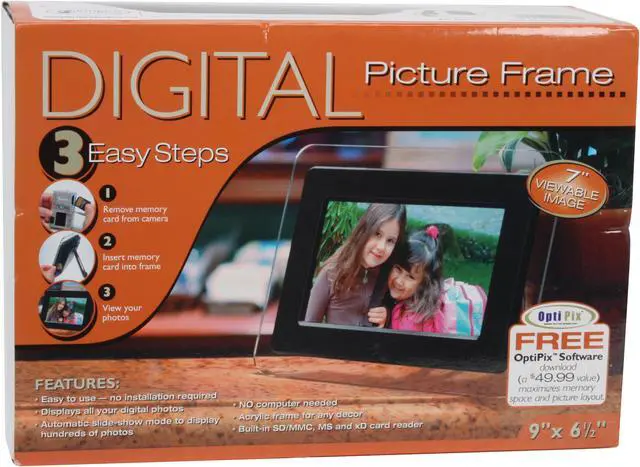 | Specifications | Resolution: 480 x 234 Built-in card reader for: SD/MMC/MS/xD Supported File Formats: JPEG |