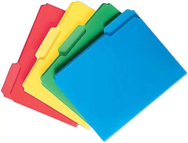 Heavy-duty polypropylene folders are tear- and water-resistant. Ideal for filing system speed and efficiency. Acid and PVC-free. File Folder Size Type: Letter; File Folder Color: Assorted; Color Family: Multicolor; File Folder Color Assortment: Blue; Green; Red; Yellow.