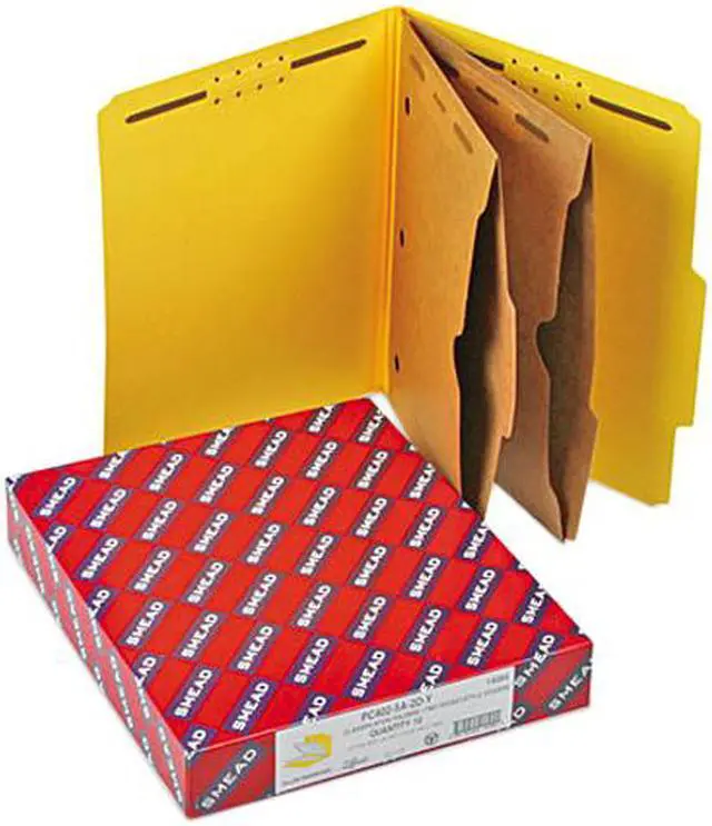 The ultimate classification folder when safety and security are most important. SafeSHIELD® bonded fasteners add protection for papers and fingers, while also reducing fastener crinkling. Two pocket-style dividers for materials that cannot be punched or stapled. Made of pressboard for extra durability. Variety of colors for color-coding projects. This product was made using wood sourced from a certified managed forest. Classification Folder Type: Top Tab; Size: Letter; Number of Sections: 6; Cover Material(s): 23 pt. Pressboard.