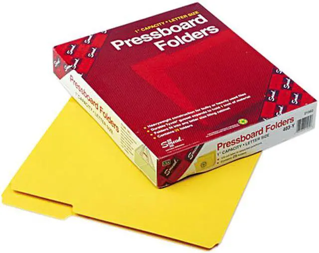 Pressboard folders offer all the advantages of tough pressboard with the added feature of color to help speed your filing. Folders come with matching color, Tyvek 1" expansion. 1/3 cut tab folders offer superior durability with pressboard that resists wear and tear. Tab is 1/2" high. File folders are made of 23 point colored pressboard with a high percentage of recycled material.