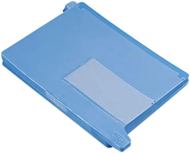Rigid, vinyl out guides with end tabs boldly mark where files have been removed. Large pocket temporarily holds full-sized documents to be filed in the folder when it is returned. Small 6-1/4" wide x 3-3/16" high pocket can hold a charge-out guide (not included). Translucent, nonglare vinyl pockets are welded to back panel. 1/2" high tabs in 1/5 cut bottom position are embossed with the word OUT. Out guides are made of 15 vinyl stock.
