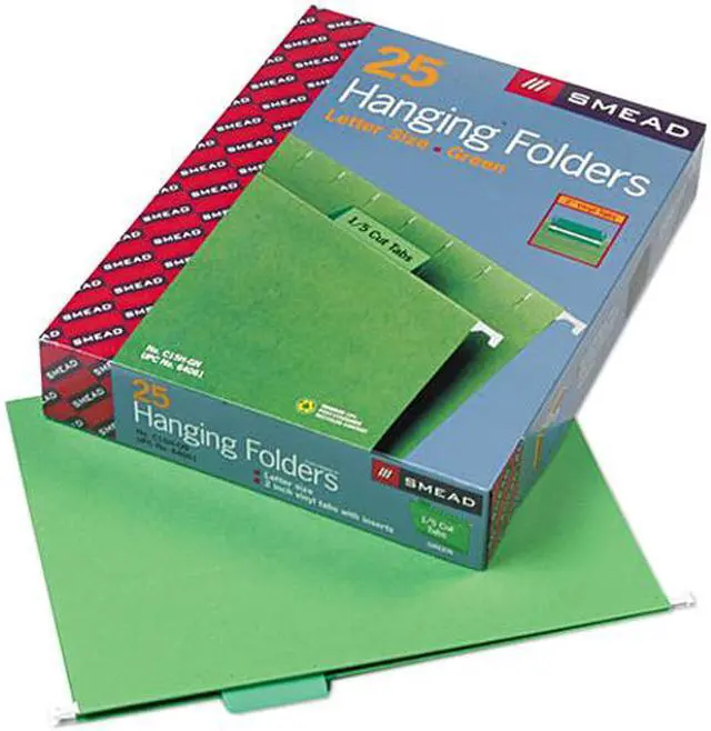 A popular choice for desk drawer files, theses colored hanging folders keep papers neatly vertical in the file. Coated rod tips slide easily on file drawers. Clear poly tabs can be positioned in several locations on front or back panel. Repositionable poly tabs are 1/5 cut and 1/2" high. Hanging folders include replaceable white inserts. Use with colored interior folders to prevent misfiling. Hanging folders are made of 11 point color stock.