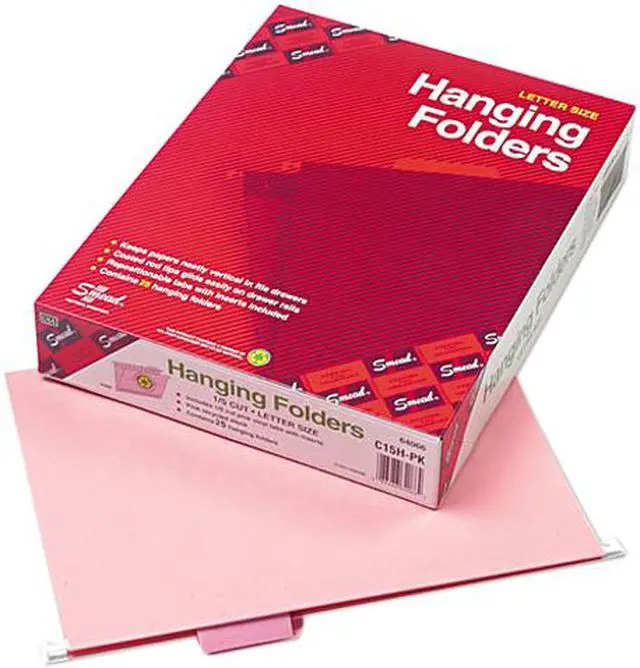 Hanging folders keep papers neatly vertical in their files. No more slumping folders or folders that slip under one another. Vivid colors help you code files for quick, easy identification. The poly tabs are all clear with a white insert. This product was made using wood sourced from a certified managed forest. Folder Size Type: Letter; Folder Color: Pink; Color Family: Pink; Folder Material: 11 pt. Stock.