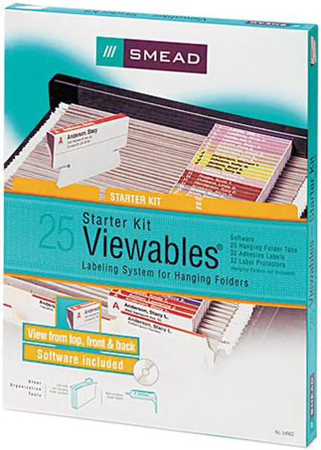 Use the Windows-based PC system software to create unique labels that attach to patented three-sided hanging folder tabs. Read tabs from front, top or back for increased filing efficiency. When used on folders with tabs in the same position, a continuous line of color is created for faster filing and retrieval. Color breaks your system into smaller sections and allows misfiled folders to stand out. Viewables Labeling System Starter Kit includes 25 tabs, 32 labels, 32 clear label protectors and software. Requires 400MHz 32-bit (x 86) or faster processor, 128MB RAM, 280MB free disk space; Microsoft Windows 2000 with Service Pack 4, Windows XP with SP2, Windows Server 2003 with SP1, Windows Vista, Internet Explorer 6.01 or later.