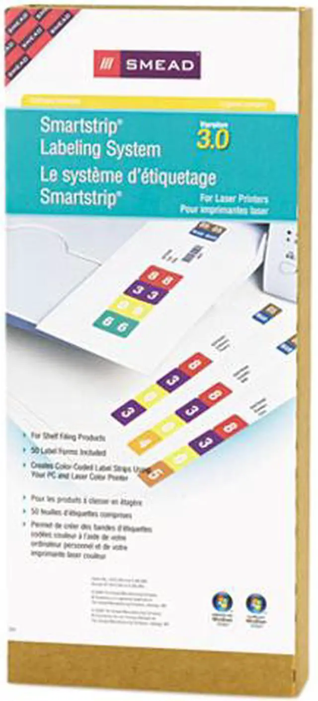 Labeling System gives you the efficiency of an end-tab, color-coded filing system using your laser printer. Choose from more than 19 different label designs. Match existing label designs through clicking and dragging the color bands. Customize text and use bar codes. Starter kit includes software and 50 label forms. Each label form contains one 7-1/2" x 1-1/2" label strip, two standard folder labels and six index or alert labels. Refill kits are sold separately.