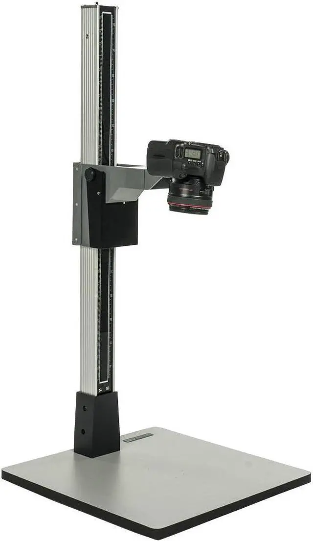 The new Smith-Victor 36" Pro-Duty Copy Stand Kit provides a complete professional system for creating precise reproductions of photographs, artwork and other objects. The sturdy baseboard features a non-reflective 18% gray matte finish that measures 17 5/8"x17 5/8" which allows for originals of up to 11x14. The column is constructed of heavy duty extruded aluminum and is designed to be low-vibration which is critical for the sharpest images possible. The column also features a height scale printed on the anodized aluminum. The copy stand has a unique carriage system - no cranks or tightening of knobs needed.