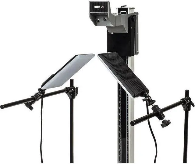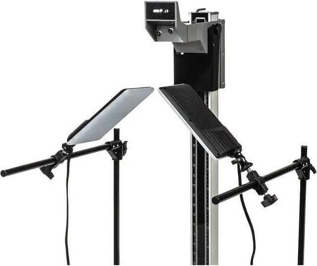 Simply squeeze the lever and the carriage can be slid up or down smoothly and quickly. Release the lever and the carriage will stop and lock at the desired, securing the camera for use. The carriage has a standard 1/4 20 mount to accept any camera and lens combination up to 8 lbs. For the perfect illumination of the original, the kit includes two fully adjustable mounting arms and two compact flat panel LED lights. The LED lights provide high output, smooth and even illumination across the baseboard and with a CRI of 95, they ensure that the color rendition of the copies will be accurate to the originals.