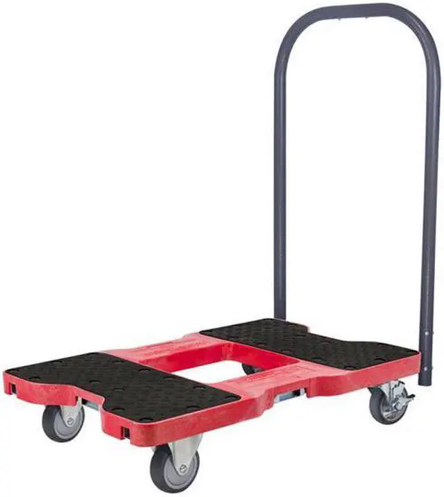Moving your stuff has never been so easy! Bar provides the leverage needed to safely push and pull loads up ramps, curbs and steps reducing the risk of back injuries from having to bend over and lift. You've probably wasted lots of time and money buying the same old junky carts that don't roll well and drop things. Snap-Loc Push Cart saves you time with easy rolling large casters and optional E-Strap attachment to lock and load more stuff! Dolly has high quality USA made construction built to last a lifetime saving you money by eliminating the need to constantly replace junky equipment. Only the Snap-Loc Push Cart transforms when you need it into a Dolly. Bars are 1-1/4 inch heavy duty steel tubing with powder coated protection and can disconnect into multiple pieces for easy storage. Fully integrated steel frame has 4 built in "SNAPLOCS E-Track Singles" to safely tie down professional movers Logistic E-Straps. Optional positive locking E-Straps safely contain more items on the Dolly and can be used as additional handles to easily control the load. Casters are made from heavy duty steel with ball bearings and non-marking airless 4 inch thermoplastic softer rubber wheels for rolling over softer interior flooring (for more caster options search other Snap-Loc Dollies). The 4 wheel dolly has 2 fixed rigid casters for easy directional steering and 2 swivel-brake casters that can lock in place on unleveled ground (If you want all 4 casters to spin for on the spot spin-ability, order the Dolly without bars and order the Push Bar or Panel Bars separately). Snap-Loc Dolly is designed with a flat deck and large grip pads to secure cargo in place. Body and pads are made from long lasting industrial strength structural polypropylene. Dolly is the perfect size to fit through doorways, transport in vehicles and stow away in a small space measuring 32 inches long 20-1/2 inches wide and 7 inches tall (with removable bar on 33.5x20.5x38 and space between bars is 17.5).