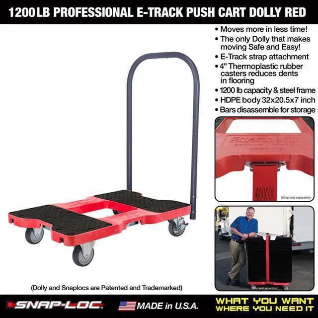 "Safely Moves More in Less Time" with easy rolling 1,200 pound capacity, removable Push Bar and optional E-Strap safety attachment!