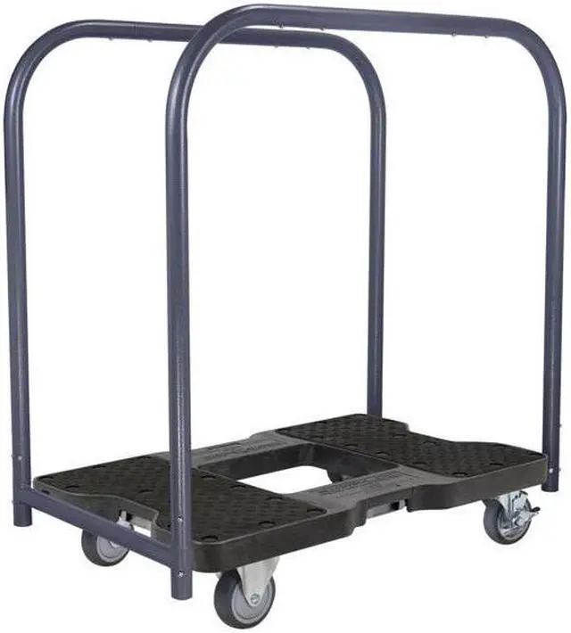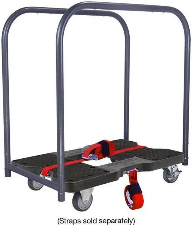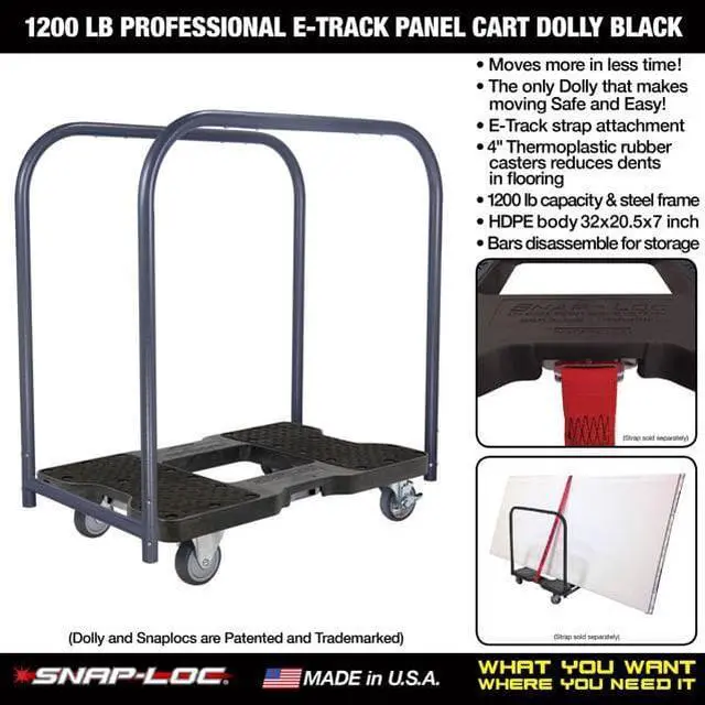 Moving your stuff has never been so easy! Moves more than just lumber, drywall, pipe and tables, only the Snap-Loc Panel Cart transforms when you need it into a Dolly or Push Cart for moving everything! Bars provide the leverage needed to safely push and pull loads up ramps, curbs and steps reducing the risk of back injuries from having to bend over and lift. You've probably wasted lots of time and money buying the same old junky carts that don't roll well and drop things. Snap-Loc Panel Cart saves you time with easy rolling large casters and optional E-Strap attachment to lock and load more stuff! Dolly has high quality USA made construction built to last a lifetime saving you money by eliminating the need to constantly replace junky equipment. Bars are 1-1/4 inch heavy duty steel tubing with powder coated protection and can disconnect into multiple pieces for easy storage. Fully integrated steel frame has 4 built in "SNAPLOCS E-Track Singles" to safely tie down professional movers Logistic E-Straps. Optional positive locking E-Straps safely contain more items on the Dolly and can be used as additional handles to easily control the load. Casters are made from heavy duty steel with ball bearings and non-marking airless 4 inch thermoplastic softer rubber wheels for rolling over softer interior flooring (for more caster options search other Snap-Loc Dollies). The 4 wheel dolly has 2 fixed rigid casters for easy directional steering and 2 swivel-brake casters that can lock in place on unleveled ground (If you want all 4 casters to spin for on the spot spin-ability, order the Dolly without bars and order the Push Bar or Panel Bars separately). Snap-Loc Dolly is designed with a flat deck and large grip pads to secure cargo in place. Body and pads are made from long lasting industrial strength structural polypropylene. Dolly is the perfect size measuring 32" long 20-1/2" wide and 7" tall (with removable bars on 35x20.5x38 and space between bars is 17.5).