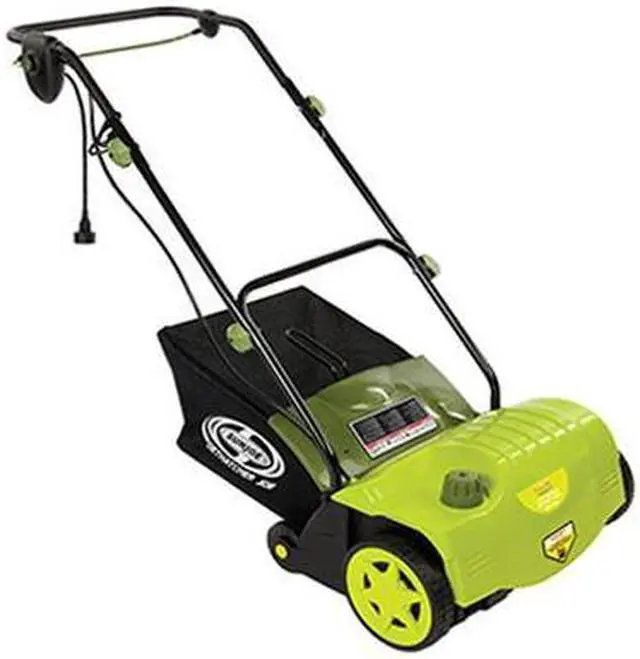 LET YOUR LAWN BREATHE WITH THIS TOP-SELLING DETHATCHER FROM SUN JOE. Garnering top reviews from lawn experts and garden enthusiasts alike, the Sun Joe AJ800E 14-inch electric dethatcher is your go-to tool to get your lawn in tip-top shape. Powered by a robust 11-amp motor, the Sun Joe rakes an impressive 14-inch wide raking path. Enhancing its raking ability is an exclusive AirBoost technology system, which maximizes thatch pickup with 24 spring steel tines that stay sharp longer for reliable performance. Use the 5-position depth control knob to tailor this dethatcher's raking depth from -0.12 in. (3 mm below the soil) to 0.35 in. (9 mm above the soil), depending on your lawn's dethatching needs. Thatch is a dense mat of roots, stems and grass clippings that accumulates on lawns over time, blocking the flow of water, oxygen and vital nutrients. It is important to periodically remove thatch in order to keep your lawn green and healthy. While ordinary manual rakes are tiresome to use and not very effective, the electric Dethatcher Joe starts instantly with the push of a button and easily gets the job done without polluting the atmosphere with toxic carbon emissions. No gas, oil or tune-ups make the Sun Joe your green choice for greening your lawn. ETL-approved. 2-year warranty.