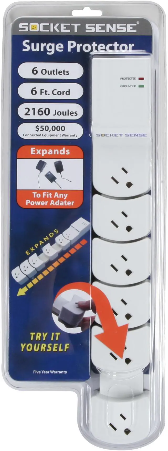 The Socket Sense 6-Outlet Expandable Surge Suppressor handles all power adapters with ease. Simply expand or contract the movable sockets to adjust for the best fit. Compare this to a typical surge strip where power adapters typically block one or more sockets. It can do the job of two ordinary surge strips.