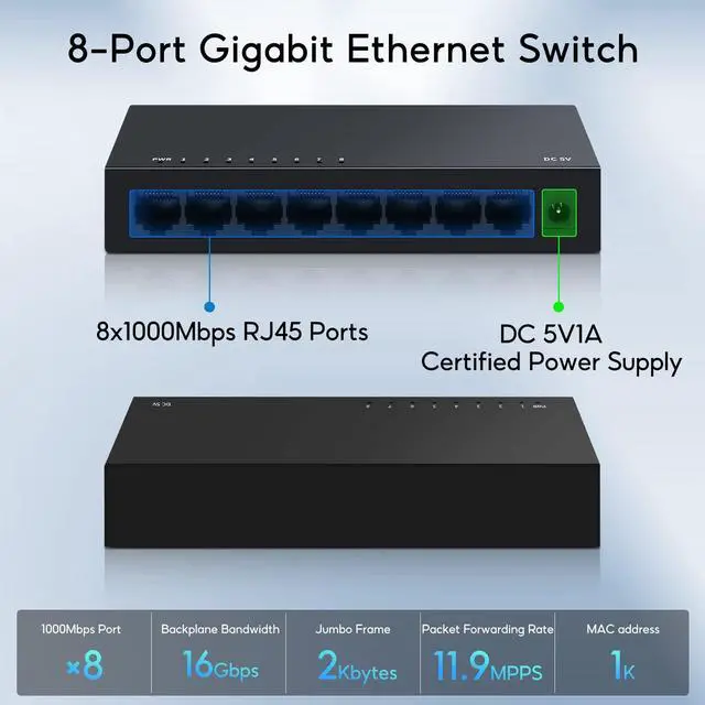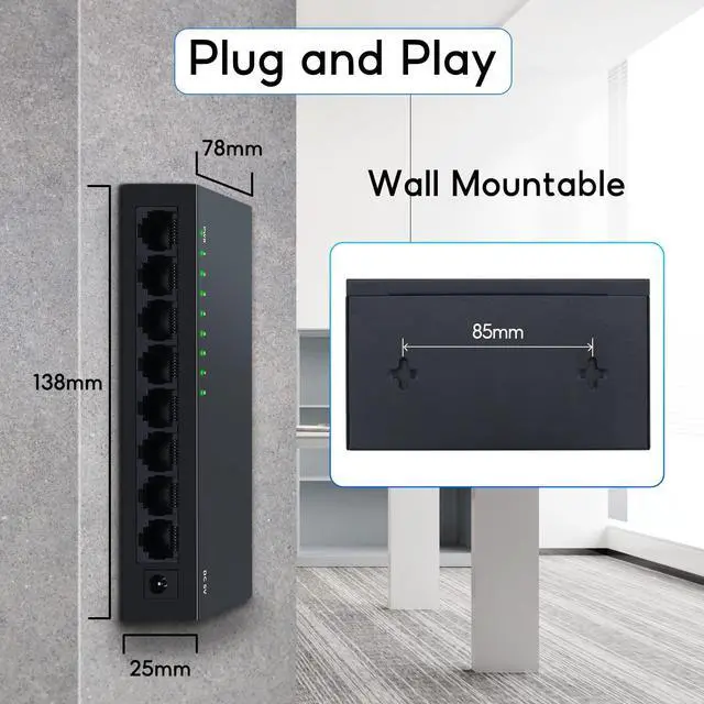 This switch has a metal body and fanless silent design. Better heat dissipation than other plastic housing network switch.