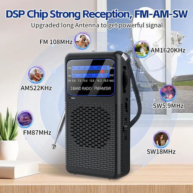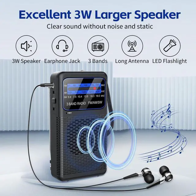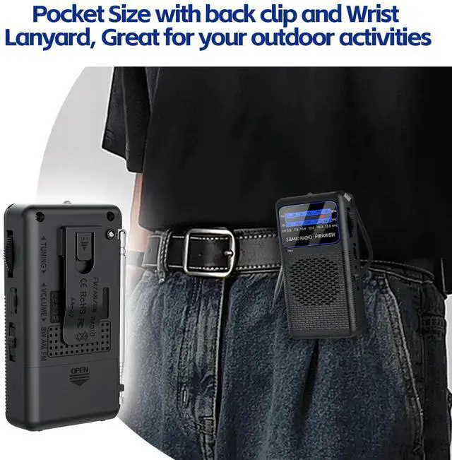 AM FM SW 3 Band Pocket Radio, Portable Battery Operated Shortwave Radio, Back Clip Transistor radios with 3.5mm Earphone Jack, Emergency LED Flashlight for Camping, Home
