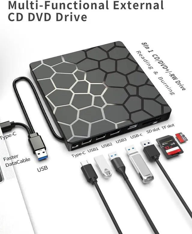 1. The external optical drive can not only burn and read CDs and DVDs, but also serve as an external USB hub for laptops. It is compatible with USB hard drives, limited/wireless mice and keyboards, computer heat sinks, and other USB computer accessories. The card slot is perfect for transferring camera photos and video files from the card to the computer (note: the SD port and TF port cannot be used simultaneously)