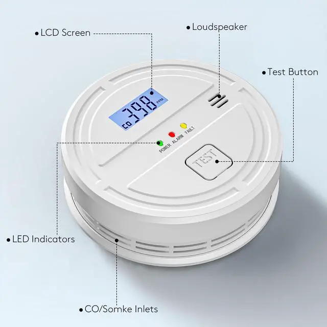 This carbon monoxide detectors/smoke alarm detects smoke with photoelectric sensor and detects CO by electrochemical co sensor. 2-in-1 function means that you don't have to install 2 smoke alarms separately.This helps to save installation space.Large LCD display of fire alarm make you read easily, and it has a more than 85dB sound, make you hear easily and you can take action at once. Battery operated, easy installation. This smoke detector carbon monoxide detector combo has a low battery warning, so it can remind you of replacing batteries in time.