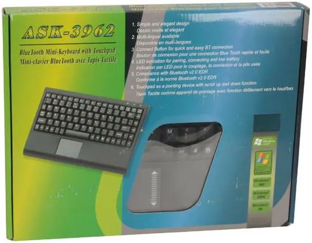 | Features | Simple and elegant design Multi-Lingual available Connect Button for quick and easy BT connection LED indication for pairing, connecting and low battery Compliance with Bluetooth v2.0 EDR Touchpad as a pointing device with scroll up and down function |