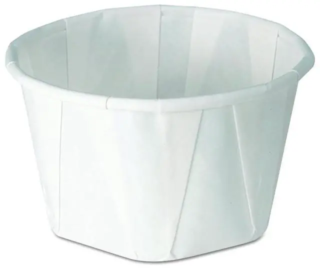 Treated, heavy-duty, multi-pleated paper cups hold up well against liquids. Rolled-wax rim maintains shape and tightness even when wet. Perfect for small servings of sauces and dressingson premise. Cup Type: Portion; Capacity (Volume): 3.25 oz; Material(s): Paper; Color(s): White.