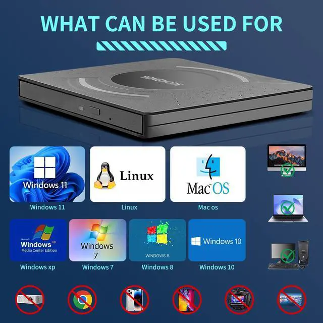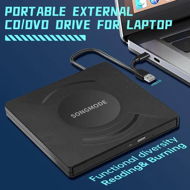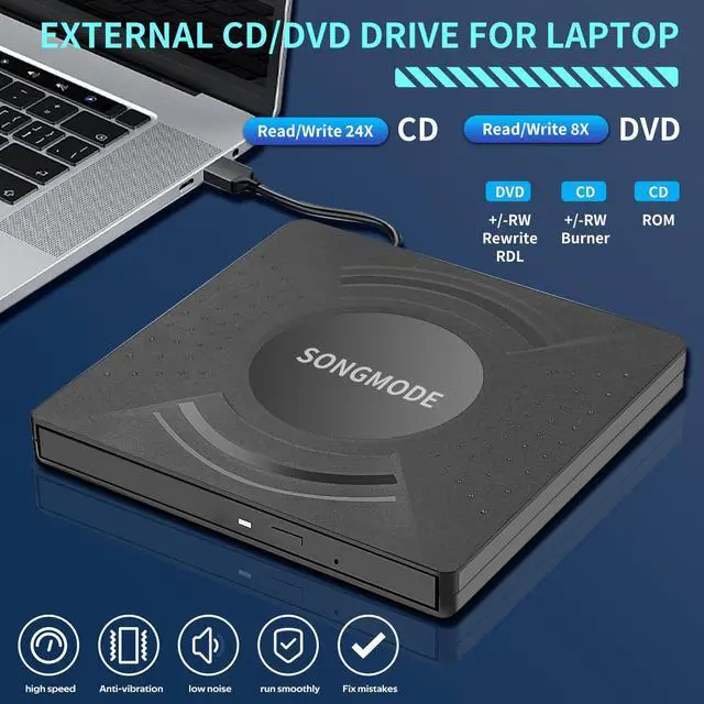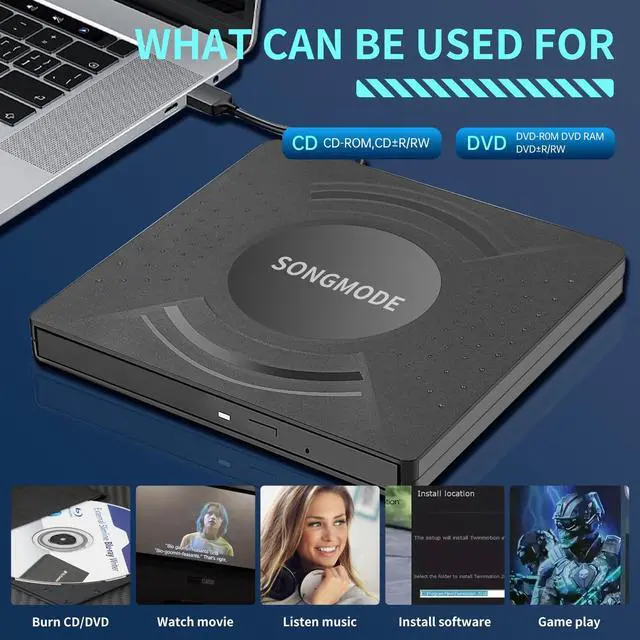 • Multiple functions: Supports reading and burning CDs and DVDs. You can play music CDs, watch DVD movies, install software from discs, and backup data.