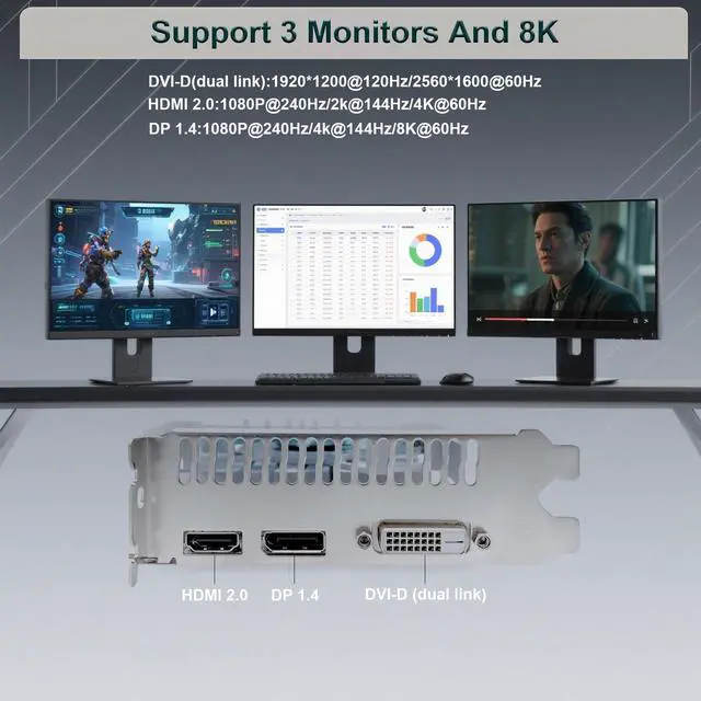 Triple Display Ready (HDMI+DP+DVI):Connect up to 3 monitors simultaneously with HDMI 2.0, DisplayPort 1.4, and DVI-D ports.
