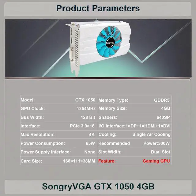 SongryVGA GTX 1050 Graphics Card,4GB 2048SP GDDR5 128-Bit PCIe 3.0 x16 6-Pin Power Connector 1080p Ready with HDMI/DP/DVI Output Ports for Gaming