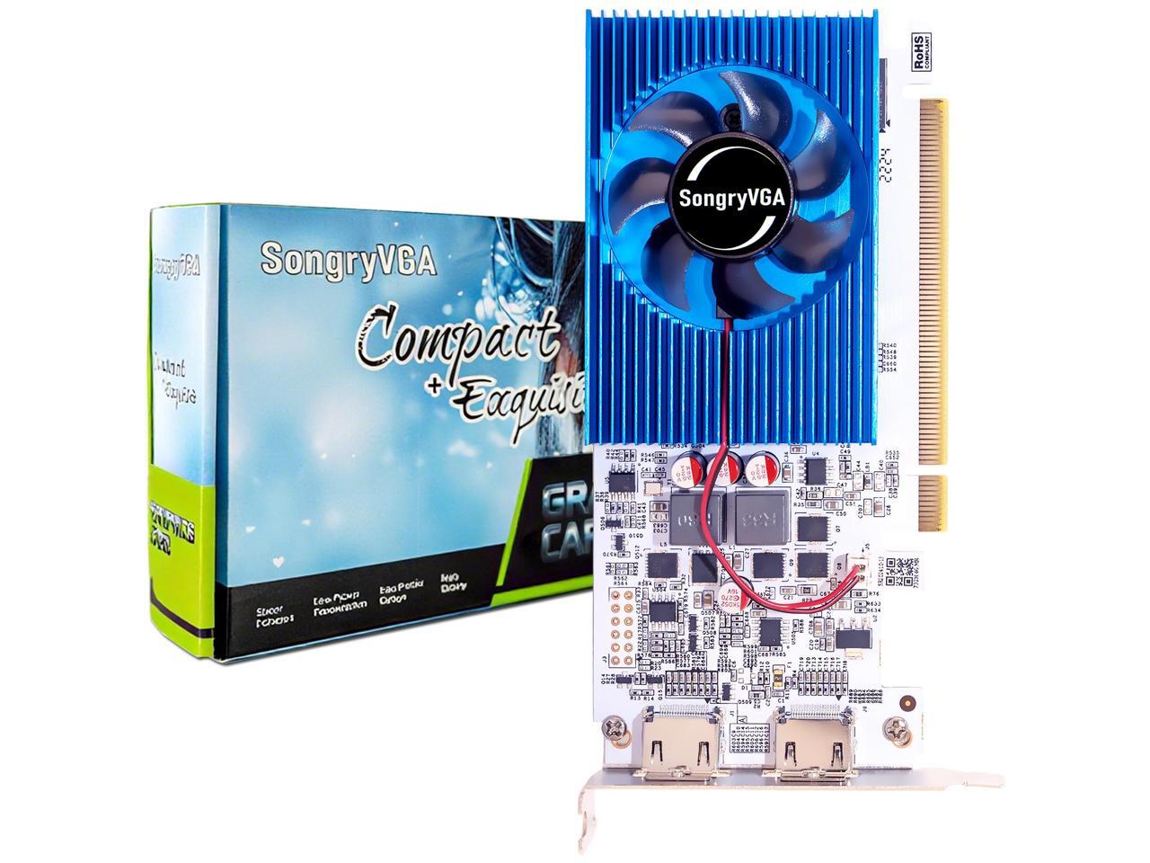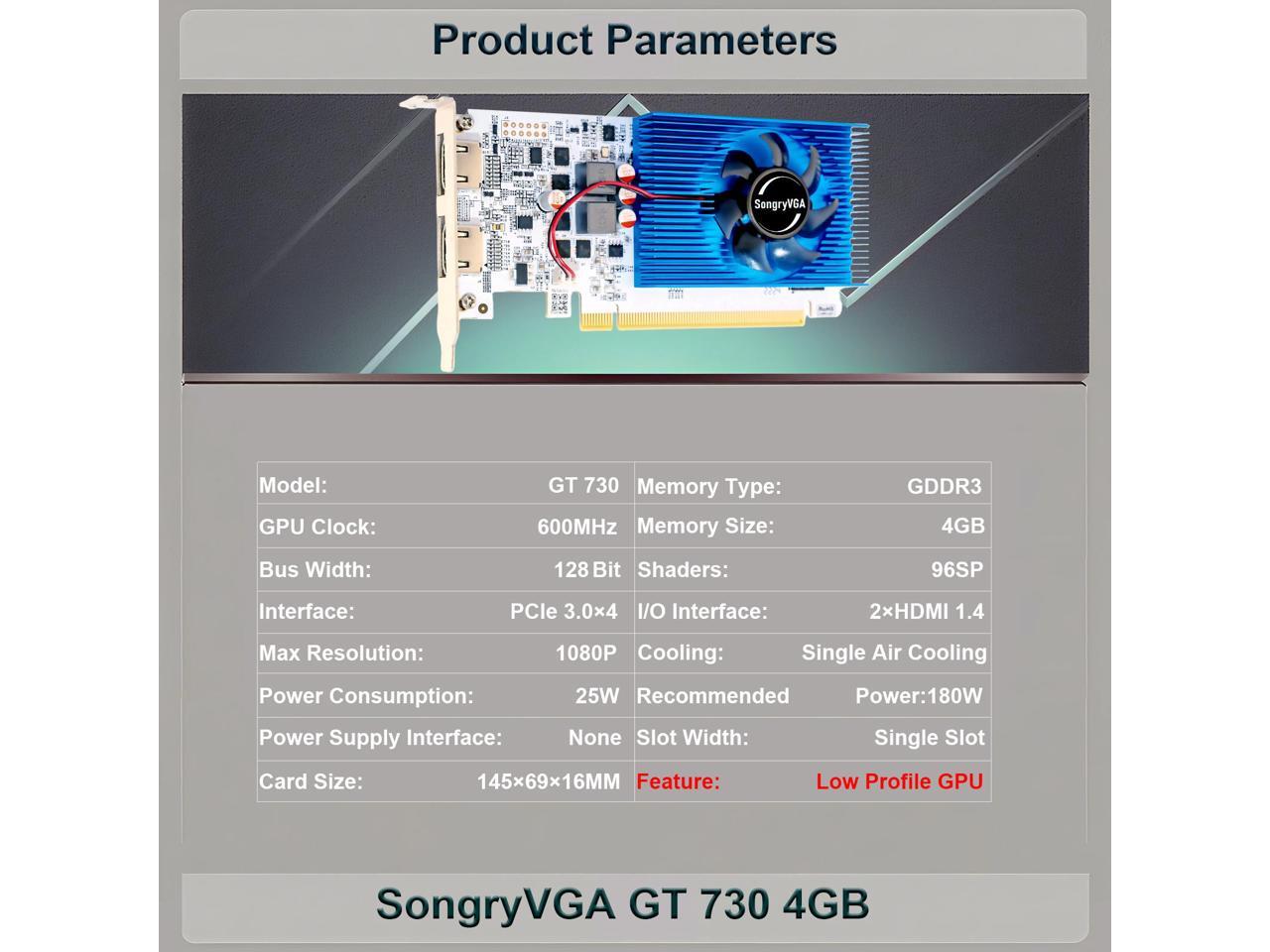 SongryVGA GT 730 4GB Low Profile Graphics Card,GDDR3 128 Bit PCIe 2.0 x16 2xHDMI Outputs 1080P DirectX11 OpenGL 4.6 Support,Ideal for Office, All-in-One PCs,Mini Thin Desktop Computers