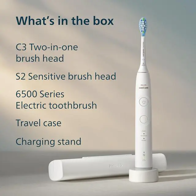 | Includes Accessories | 1x Philips Sonicare 6500 Series electric toothbrush, 1x C3 Two-in-one & 1x S2 Sensitive brush heads, 1x travel case, 1x charging stand (power adapter not included) |
