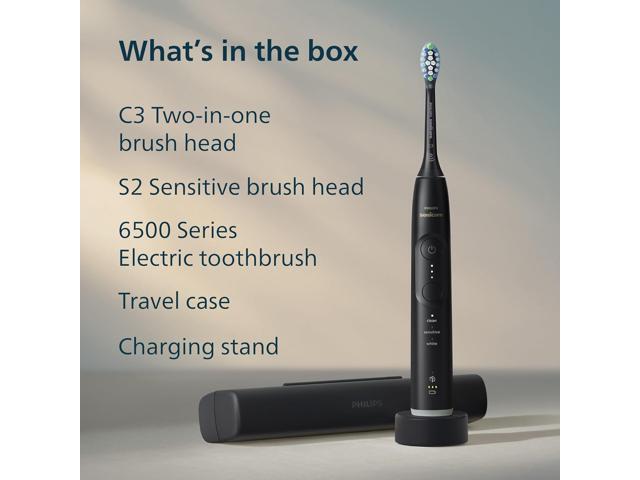 - What's in the Box:1x Philips Sonicare 6500 Series electric toothbrush, 1x C3 Two-in-one & 1x S2 Sensitive brush heads, 1x travel case, 1x charging stand (power adapter not included)