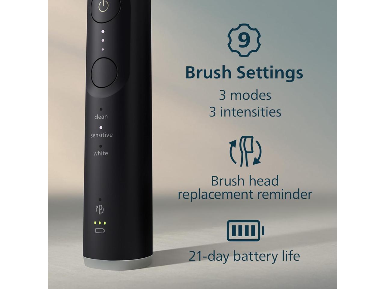 - Personalize your cleaning experience with a sonic electric toothbrush featuring 3 brushing modes: Clean, Sensitive & White, and 3 intensity levels