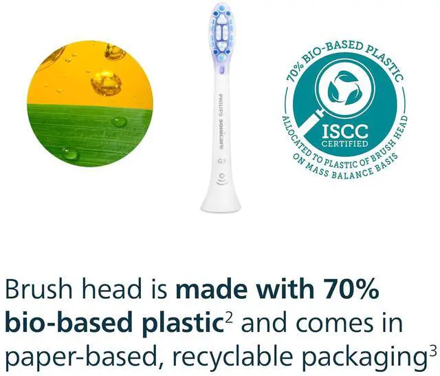 • Philips aims to reduce the use of fossil fuel-based plastic, that's why 70% of the plastic in these sonic toothbrush replacement heads is bio-based; paper-based recyclable packaging