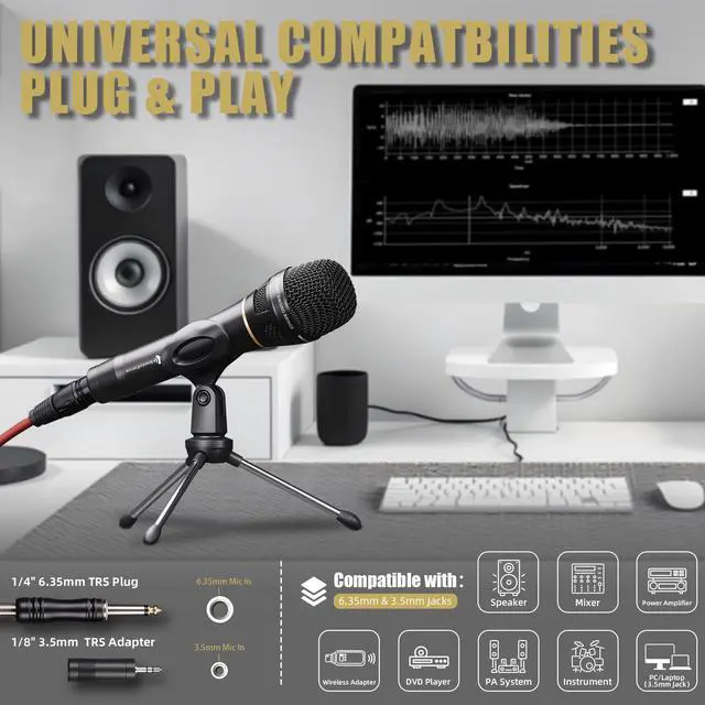 Our kit is universally works with standard XLR interfaces for professional recording setups, such as Speakers, Mixers, AMPs and DVDs. And the bouns 1/8" (3.5mm) TRS adapter connect directly to laptops or pc with the 3.5mm "mic in".