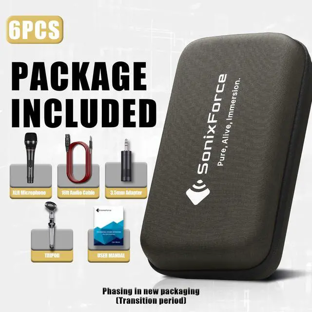 Hello! SonixForce microphone set comes with a dynamic microphone, an audio cable, a 1/8"(3.5mm) TRS adapter, a tripod tabletop stand, a storage pouch and a carrying case that meet you need.