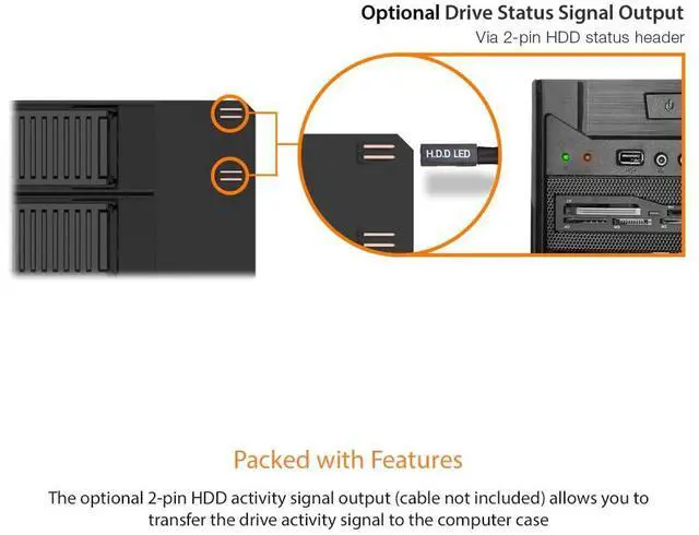 The optional 2-pin HDD activity signal outputs (cable not included) allow you to transfer the drive activity signal to the computer case or LED panel and lets you monitor the drive activities in your desired location.