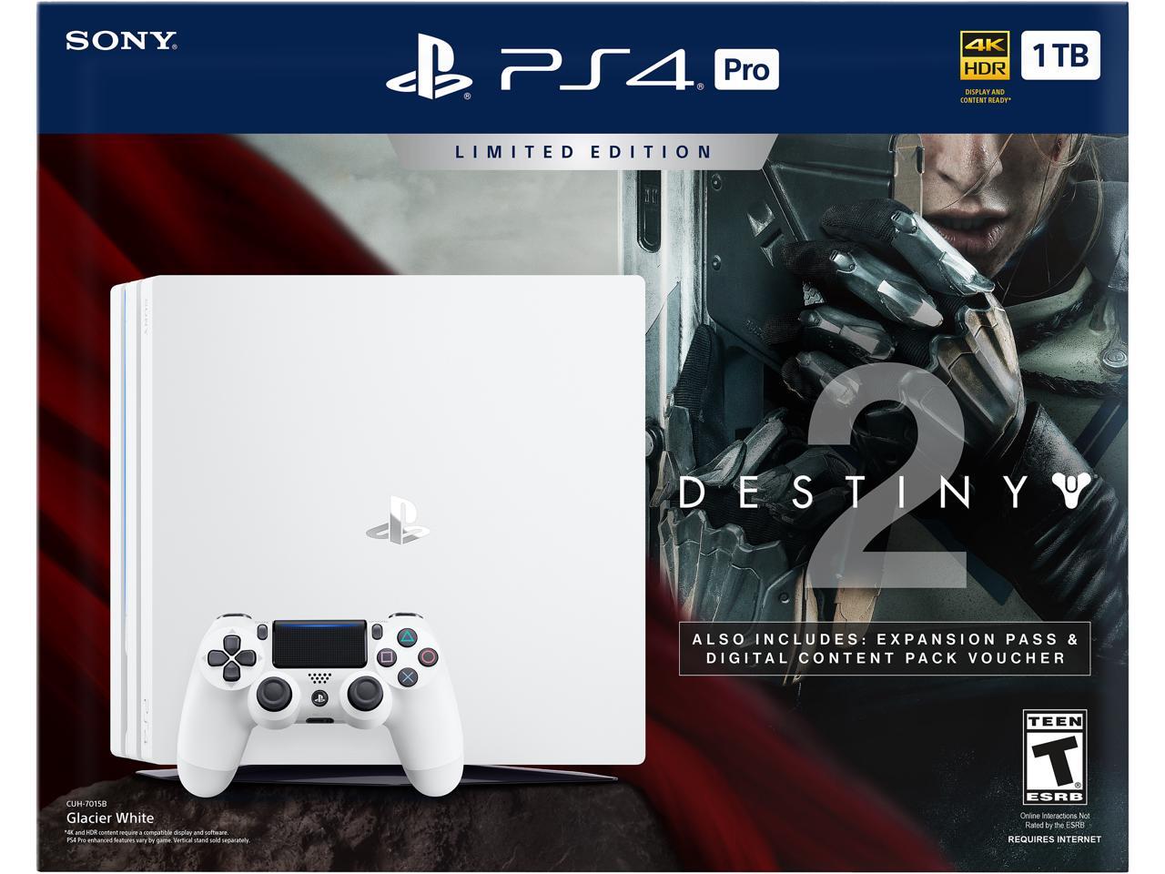 This Limited Edition bundle is the perfect package for existing and new Destiny fans. Includes a Glacier White PS4 Pro system, matching DUALSHOCK 4 Wireless Controller, Destiny 2 game on Blu-ray Disc and Expansion Pass +Digital Content Pack voucher.