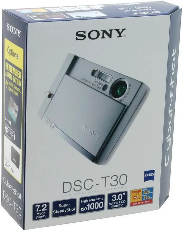 | Package Contents | DSC-T30 Digital Camera, NP-FR1 Rechargeable InfoLithium Battery, BC-CS3 External Battery Charger, A/V, USB, DC-in Multi-connector Cable, Wrist Strap, Software CD-ROM |