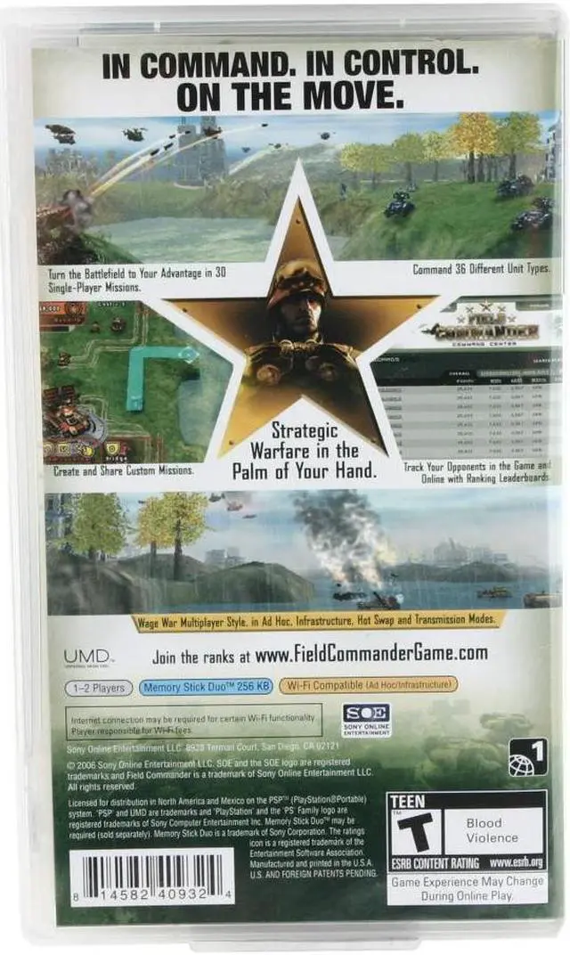 From Sony Online Entertainment, the makers of Untold Legends on PSP, Field Commander is a turn-based strategy game for the portable system. Use any of the game's 15 military units to conquer the opposing army, and deploy your field of 11 officers to lead the battle. Field Commander features 30 single-player battles, plus offers a level designer function and multiplayer head-to-head over ad-hoc and internet play.