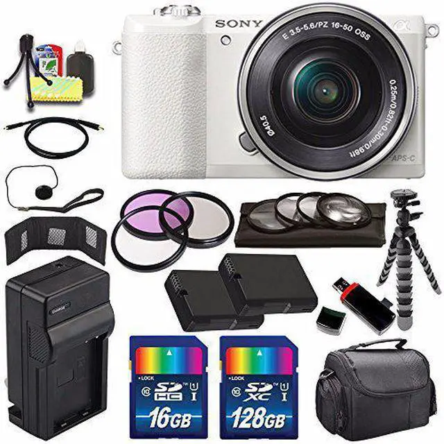 Our Kit Includes: - Sony Alpha A5100 Digital Camera w/ 16-50 Lens White- Two Extra Rechargeable Lithium Ion Replacement Battery- External Rapid Quick, Travel Charger with Car Charger Attachment- 16GB SDHC Class 10 High Speed Memory Card- 128GB SDXC Class 10 High Speed Memory Card- +1 +2 +4 +10 Close-Up Macro Filter Set with Pouch - 3 Piece