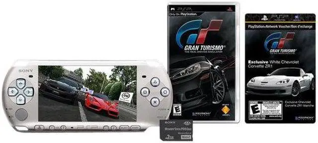 | Features | Gran Turismo for the PSP features more than 800 vehicle models from the world's top manufacturers with more than 4,500 total paint variations, and 35 tracks. The game, which runs at 60 frames per second, also allows gamers to trade and share unlocked vehicles with others online via ad hoc mode. Car download - Includes an exclusive PlayStation Network voucher to download a white version of the Chevrolet Corvette ZR1 for Gran Turismo, the same car featured on the cover of the game. PlayStation Network movie voucher - Consumers can easily download a movie from the PlayStation Network to their PSP system. Title to be announced. 2GB Memory Stick PRO Duo - Leverages the PSP system's multimedia functionality by storing photos, music, videos, and game saves. |