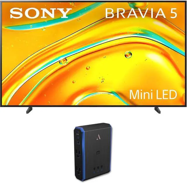 DTS: X - Blur-Free Action with XR Motion Clarity - Acoustic Multi-Audio - Voice Zoom 3 Powered by AI for Clear Dialog - Built for Bravia Theatre Soundbars - Perfect for PS5 - Auto HDR Tone Mapping - Auto Genre Picture Mode - Game Menu for all Gaming Picture Settings - Premium Two-Way Narrow Stand - Stand Built to Accommodate Soundbar - Bravia Cam Compatible - Eco Dashboard - HDMI Input x 4 - Digital Audio Output x 1 - USB Ports x 2 - Ethernet Port x 1 - RS-232C Input x 1 - Wi-Fi 6 - VESA 600mm x 400mm - 120Hz Refresh Rate - Android 12 OS - S-Force Front Simulated Surround Sound - ( 86.62"W x 49.5"H x 3.37"D ) - (Black) with an Austere 5S-PS4-US1 Power Outlet - Premium Surge Protection - 4 Outlet Power - 3000J - Type II PureFiltration - Flameless MOV Protection - Overcurrent Protection - Smartfit Outlets - USB-C 20W Power Delivery - Omniport USB Charge - aDesign Fireproof Enclosure - Component Guarantee - Lifetime Guarantee - ( 5.800"W x 2.500"D x 4.125"H ) - (Black/Blue)