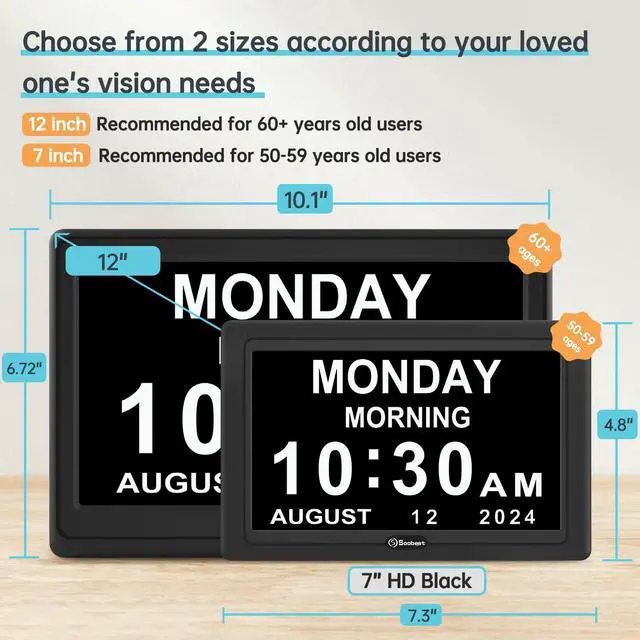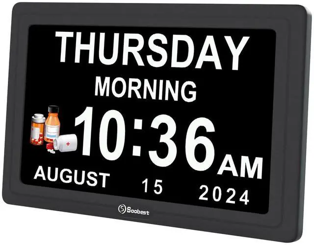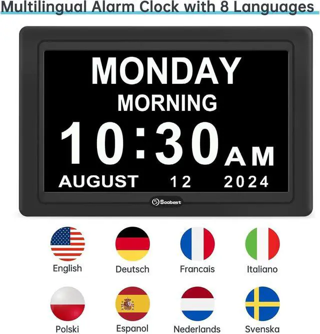 Soobest digital day clock with date inputs 8 language. And it is powered by adapter (included), which could keep the clock running. The battery memory function is a must-have elderly-friendly function, it will save all your alarm setting in case of power outage.
