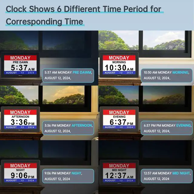 Soobest dementia clock’s advanced mode will display 6 time periods at corresponding time: Morning, Afternoon, Evening, Night, Midnight,Pre Dawn. And the day clock has 5 levels of brightness to help your family member have a good dream.