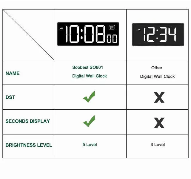 5 Adjustable dimmer levels could be applied to varied situation. Please remember to turn the DST function on if you live in an area that observes daylight saving time, then it will automatically spring forward/fall back in event of missing any important appointment.