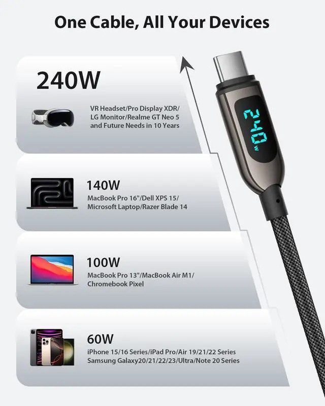 ![Alt view image 7 of 7 - 240W USB C to USB C Cable, [6.6ft,2-Pack] Nylon Braided Fast Charging Cable with LED Display for lPhone 17/17 Pro/16 Plus/15 Pro Max,lPad Air,MacBook Pro,Galaxy S25/S24, Pixel, LG (Black)](https://c1.neweggimages.com/productimage/nb640/C5JMD26030408XA8C23.jpg)
