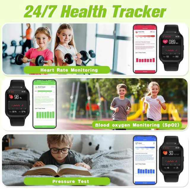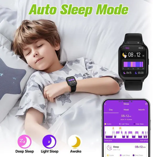 HEALTH & SLEEP MONITORING - Stay informed about your child's heart rate, blood oxygen, and stress data by selecting the 24/7 detection mode. The sleep-monitor feature of our kids watch provides insights into various sleep stages, such as the duration of deep sleep, and offers helpful tips to improve sleep quality.