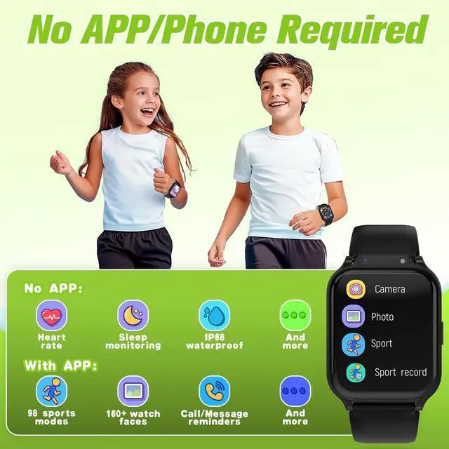 Smart Watch for Kids 1.85" with Fitness Tracker, Sleep Monitor, 22/100+ Sport Modes, DIY Dial, IP68 Waterproof, Step Counter, Heart Rate, Camera, with/Without APP, Gift for 3-12 Years Old Boys Girls